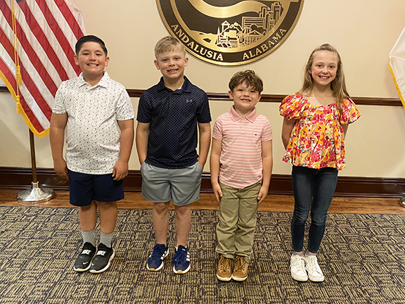 The Andalusia City Council recently recognized members of the Andalusia Youth Wrestling Club for their recent wins in state competition. Shown from left are Jayden Lockhart, who won the 8U – 98-pound Boys State Championship; Ronan Stacks, who won the 8U – 78-pound Boys State Championship; Ace George, who won the 6U – 56-pound Boys State Championship; and Raylan Stacks, who won the 12U – 64-pound Girls State Championship. Congratulations!